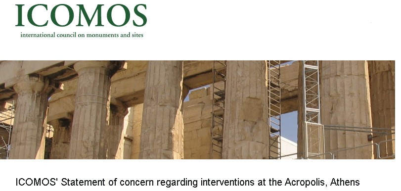 Τον βαθύ προβληματισμό του σχετικά με τις «εργασίες αναστήλωσης» που πραγματοποιούνται στον αρχαιολογικό χώρο της Ακρόπολης εκφράζει με ανακοίνωσή του το Διεθνές Συμβούλιο Μνημείων και Τοποθεσιών (ICOMOS – International Council on Monuments and Sites) και επίσημος τεχνικός σύμβουλος της UNESCO, ορμώμενο από τις πληροφορίες που μεταδίδονται διεθνώς για την κατασκευή οδοστρώματος από οπλισμένο σκυρόδεμα στον χώρο, σε συνέχεια πληθώρας παρεμβάσεων, λίγες μόλις ημέρες αφότου ήρθε στο φως της δημοσιότητας ρεπορτάζ του Αμερικανικού Δικτύου PBS που καταδεικνύει την δυσαρέσκεια της UNESCO για τις ενέργειες της ελληνικής κυβέρνησης.