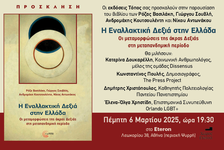 Οι εκδόσεις Τόπος καλούν στην παρουσίαση του βιβλίου των Ρόζας Βασιλάκη, Γιώργου Σουβλή, Ανδρομάχης Κουτσουλέντη και Νίκου Αντωνάκου, «Η Εναλλακτική Δεξιά στην Ελλάδα: Οι μεταμορφώσεις της άκρας Δεξιάς στη μεταπανδημική περίοδο», την Πέμπτη 6 Μαρτίου 2025, ώρα 19:30 στο Έτερον, Λεωκορίου 38, Αθήνα (περιοχή Ψυρρή)