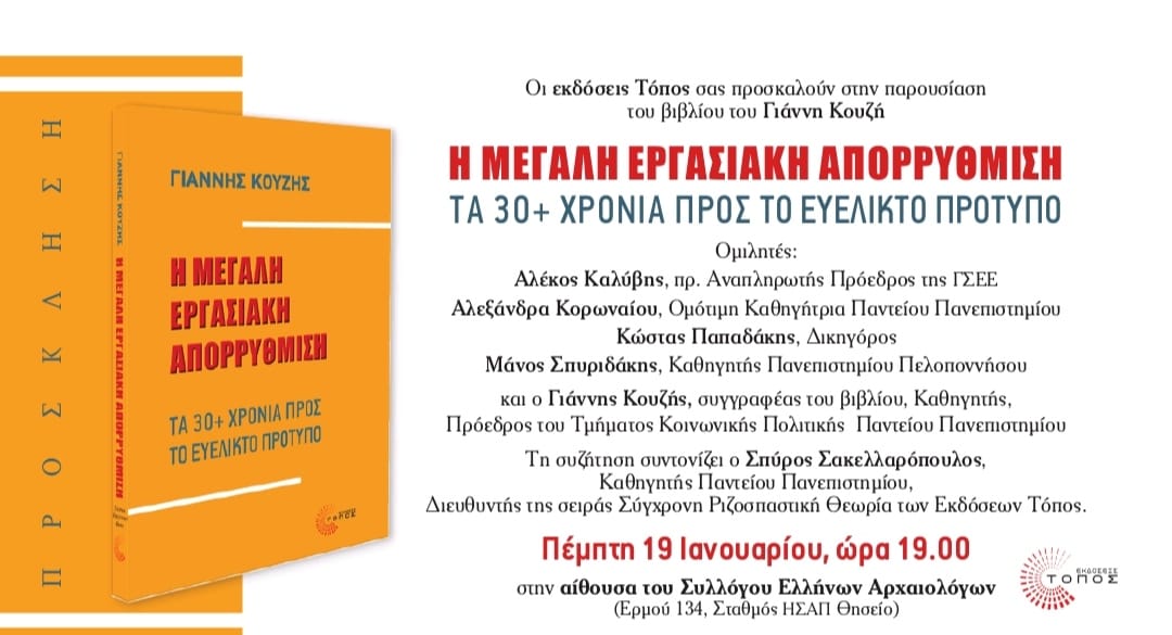Στην εκδήλωση, την οποία οργανώνουν οι εκδόσεις Τόπος, θα μιλήσουν ο Αλέκος Καλύβης, πρ. Αναπληρωτής Πρόεδρος της ΓΣΕΕ, η Αλεξάνδρα Κορωναίου, Ομότιμη Καθηγήτρια Παντείου Πανεπιστημίου, ο Κώστας Παπαδάκης, Δικηγόρος, ο Μάνος Σπυριδάκης, Καθηγητής Πανεπιστημίου Πελοποννήσου και ο Γιάννης Κουζής, συγγραφέας του βιβλίου και Καθηγητής, Πρόεδρος του Τμήματος Κοινωνικής Πολιτικής Παντείου Πανεπιστημίου.