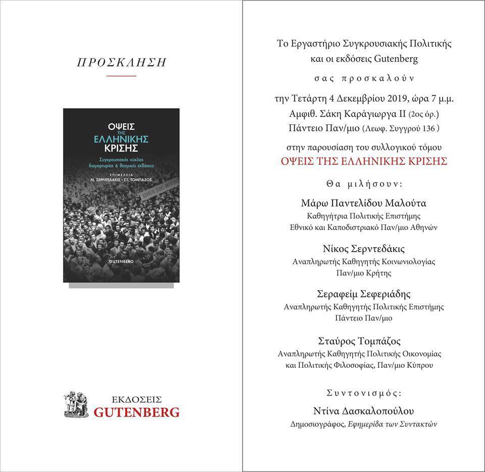 Την Τετάρτη 4 Δεκεμβρίου 2019, ώρα 19:00, στο Πάντειο Πανεπιστήμιο (Λεωφ. Συγγρού 136, Αμφιθέατρο Σάκη Καράγιωργα ΙΙ, 2ος όροφος), το Εργαστήριο Συγκρουσιακής Πολιτικής του Τμήματος Πολιτικής Επιστήμης & Ιστορίας, Πάντειο Πανεπιστήμιο και οι εκδόσεις Gutenberg παρουσιάζουν τον συλλογικό τόμο Όψεις της Ελληνικής Κρίσης. Συγκρουσιακός Κύκλος και Θεσμικές Εκβάσεις. Το βιβλίο αυτό που επιμελήθηκαν ο Νίκος Σερντεδάκις και ο Σταύρος Τομπάζος αποτελεί προϊόν μιας μακρόχρονης ερευνητικής προσπάθειας. Οι συγγραφείς του τόμου αξιοποιούν τα δεδομένα που προέκυψαν από την λεπτομερή καταγραφή των γεγονότων διαμαρτυρίας της περιόδου 2009-2014 για να ερμηνεύσουν την κορύφωση και την ύφεση της συλλογικής δράσης στη μνημονιακή Ελλάδα και τη σταδιακή μετατόπιση των προσδοκιών, για την άρση των συνθηκών και των αποτελεσμάτων της κρίσης, από το κινηματικό στο θεσμικό περιβάλλον. Τα γεγονότα διαμαρτυρίας κατεγράφησαν από την αποδελτίωση των καθημερινών φύλλων των εφημερίδων Ελευθεροτυπία και Η Αυγή από φοιτητές και φοιτήτριες του Τμήματος Κοινωνιολογίας του Πανεπιστημίου Κρήτης και η βάση των δεδομένων που προέκυψε είναι μέχρι στιγμής η πληρέστερη που διαθέτουμε ως προς το εύρος των διερευνώμενων μεταβλητών και των πληροφοριών που αντλούνται από τα ημερήσια δημοσιεύματα των εφημερίδων.