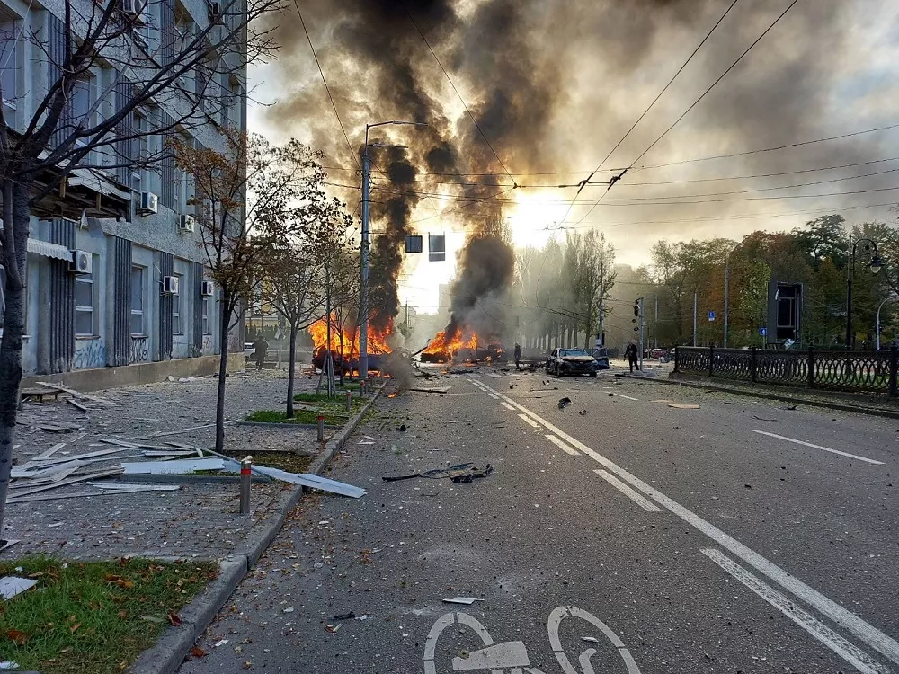 Ρωσικός πύραυλος φαίνεται πως έπληξε, επίσης, δρόμο στον οποίο βρίσκονται υπηρεσίες ασφάλειας και το γραφείο του Ουκρανού προέδρου Βολοντίμιρ Ζελένσκι ανακοίνωσε το ουκρανικό υπουργείο Εσωτερικών