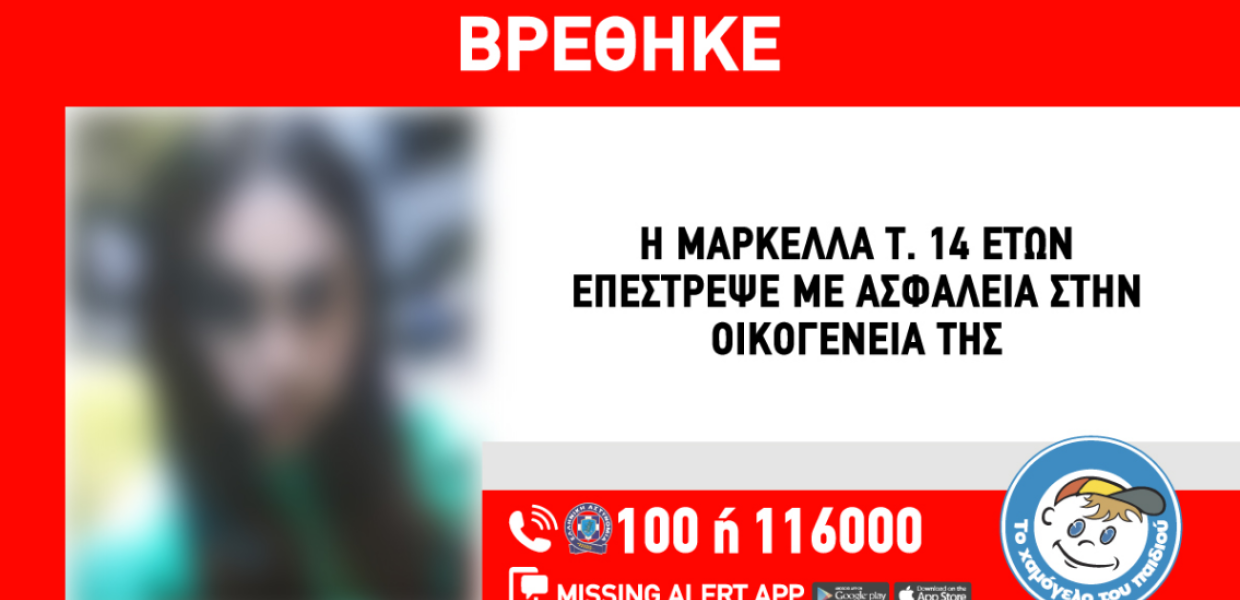 Υπενθυμίζεται ότι το βράδυ της περασμένης Παρασκευής, όταν η 14χρονη μαζί με την αδερφή της κατευθύνονταν προς το φούρνο της γειτονιάς τους, ξαφνικά εμφανίστηκε μπροστά τους ένας άνδρας ο οποίος την άρπαξε με τη βία και την έσυρε με το ζόρι μέσα στο αυτοκίνητό του.Η οικογένεια της Μαρκέλλας πήγε αμέσως στην αστυνομία και ενεργοποιήθηκε ο συναγερμός για την αρπαγή της.