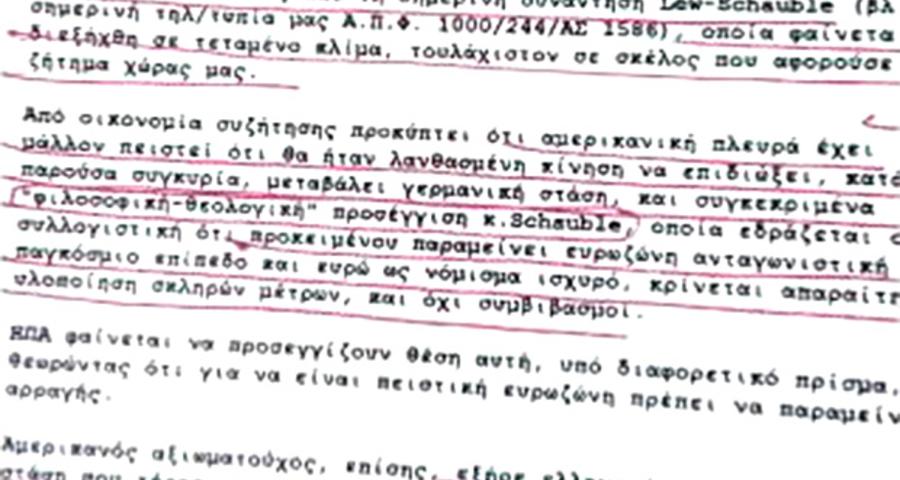 A telling quote from the telegram follows: “in short it becomes clear that the American side is persuaded that it would be the wrong move to attempt, for now, to alter the “philosophical-theological” approach of Mr.Schauble which is based on the rationale that in order for the Eurozone to remain competitive on a world scale, and the Euro a strong currency, the application of strong measures is imperative instead of compromises” as they (the US government) “approach the position from another angle, believing that in order for the Eurozone to be credible, it must remain whole”.