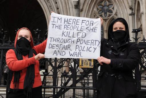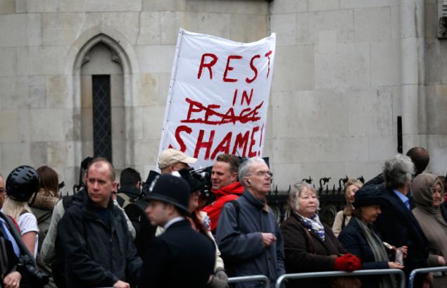 Αν και κρατήθηκαν μακριά από το επίκεντρο των εκδηλώσεων, εκατοντάδες πολιτικοί αντίπαλοι της Σιδηράς Κυρίας, με πλακάτ στα χέρια και συνθήματα, εξέφρασαν την ικανοποίηση τους για το θάνατό της.