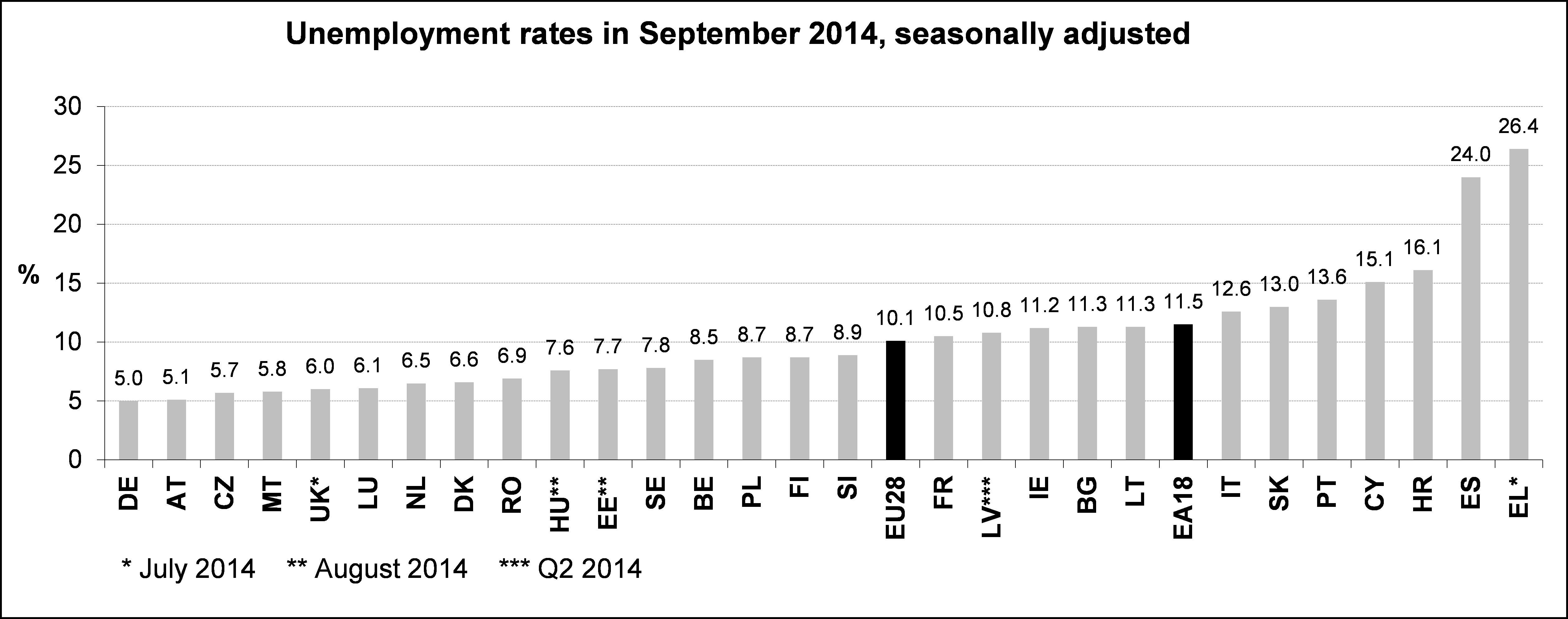 Among the Member States, the lowest unemployment rates were recorded in Germany (5.0%) and Austria (5.1%), and the highest in Greece (26.4% in July 2014) and Spain (24.0%).