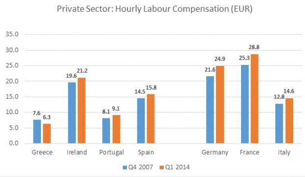 Are high wages the main problem in Greece hampering exports? Is the absence of a real depreciation the main driver of the different adjustment experience of Greece compared to the other euro area countries? The following two graphs show the simple wages measured in euros in the private sector. As we can see, hourly wages have come down substantially in Greece and are in fact the lowest in the euro area with the exception of Latvia and Lithuania. This contrasts with the experience in the other three countries adjusting, where hourly wages in the private sector have increased.