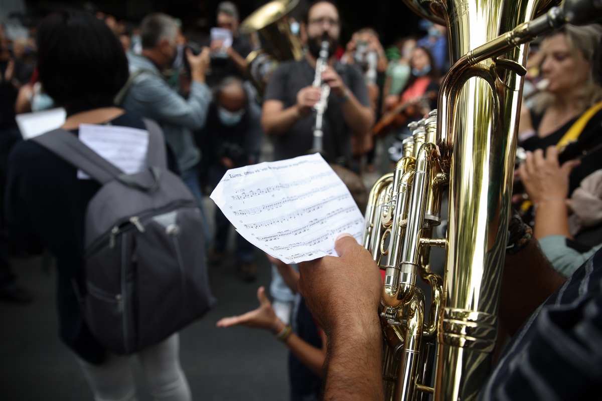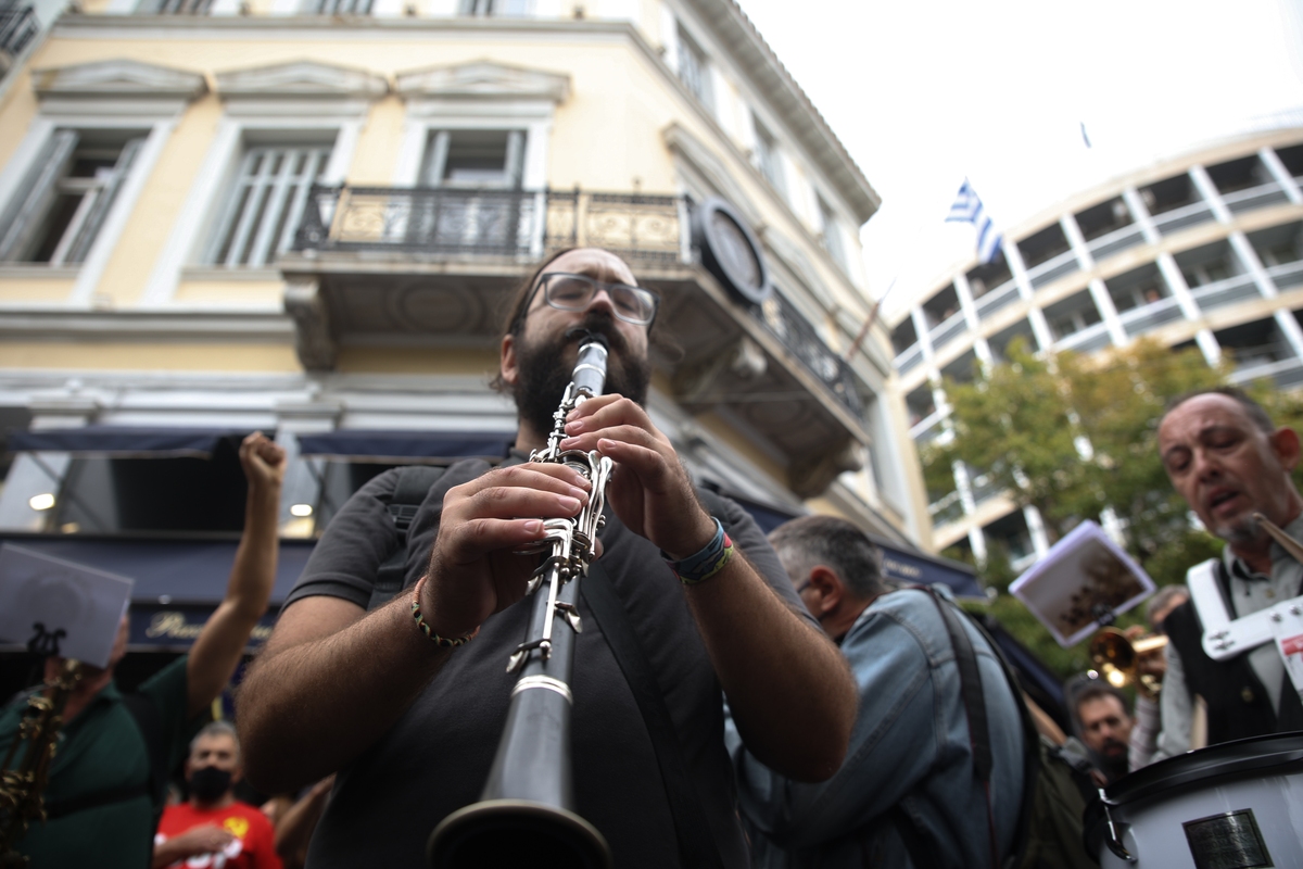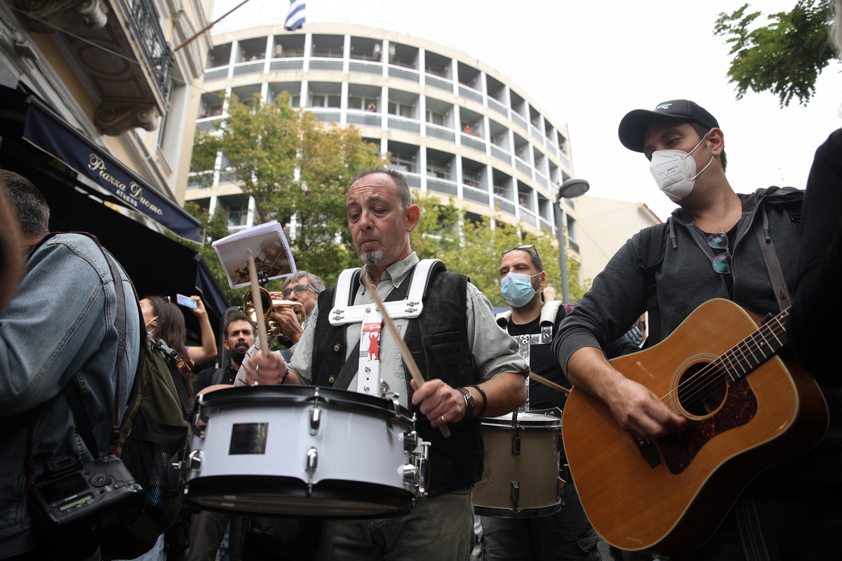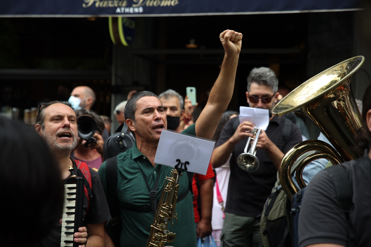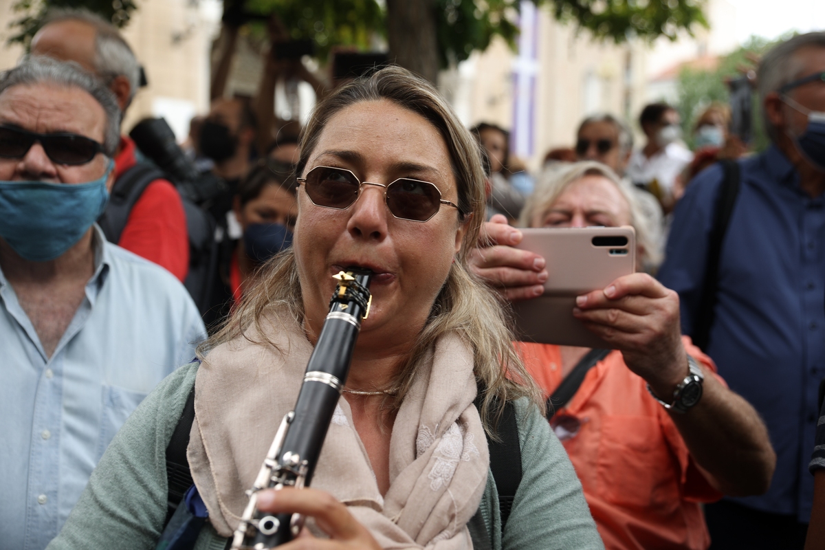 H κινητοποίηση των καλλιτεχνικών σωματείων στην Αθήνα ξεκίνησε στις 11:30 από τα Προπύλαια και ολοκληρώθηκε στη Μητρόπολη για το ύστατο χαίρε στον Μίκη Θεοδωράκη.