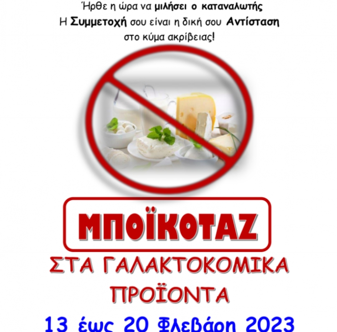 Από 13 Φεβρουαρίου ημέρα Δευτέρα έως 20 Φεβρουαρίου ημέρα Κυριακή 2023 δεν αγοράζουμε προϊόντα γαλακτοκομικά γάλατα γιαούρτια τυροκομικά εγχώρια ή εισαγωγής».