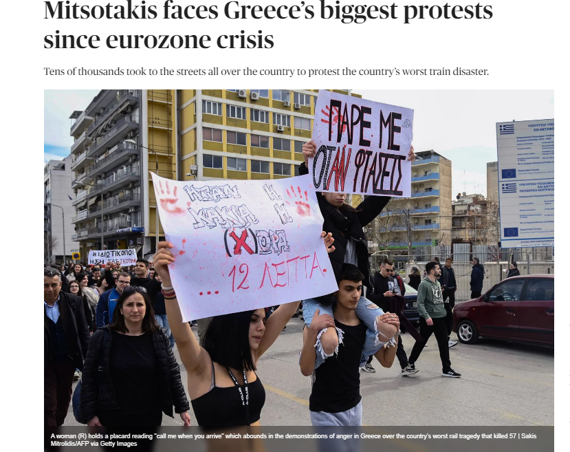 «Ο Μητσοτάκης αντιμετωπίζει τις μεγαλύτερες διαμαρτυρίες της Ελλάδας από την κρίση στην ευρωζώνη» αναφέρει το Politico, αφού «οι Έλληνες έχουν βγει στους δρόμους σε περίπου 75 πόλεις και κωμοπόλεις για να διαμαρτυρηθούν για το πιο θανατηφόρο σιδηροδρομικό δυστύχημα της χώρας, εντείνοντας την πίεση στον πρωθυπουργό Κυριάκο Μητσοτάκη ενόψει των επικείμενων εκλογών».