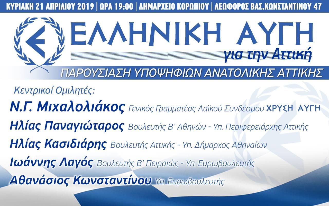 Σύμφωνα με την ανακοίνωση στην ιστοσελίδα του ναζιστικού μορφώματος, η «Ελληνική Αυγή για την Αττική» αναμένεται να παρουσιάσει την Κυριακή 21 Απριλίου τους υποψήφιους της για την Ανατολική Αττική, με κεντρικό σύνθημα «Θέλουμε τις γειτονιές μας πίσω». Κατά την ανακοίνωση, η εκδήλωση αναμένεται να πραγματοποιηθεί στο χώρο του δημαρχείου του δήμου Κορωπίου.