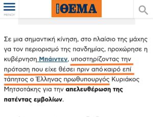 Έτσι, την ίδια στιγμή που κάποια ελληνικά μέσα, γράφουν πως η κυβέρνηση Μπάιντεν υποστήριξε την πρόταση του Κυριάκου Μητσοτάκη για άρση της πατέντας των εμβολίων, φαίνεται πως τα πράγματα έγιναν λίγο διαφορετικά.