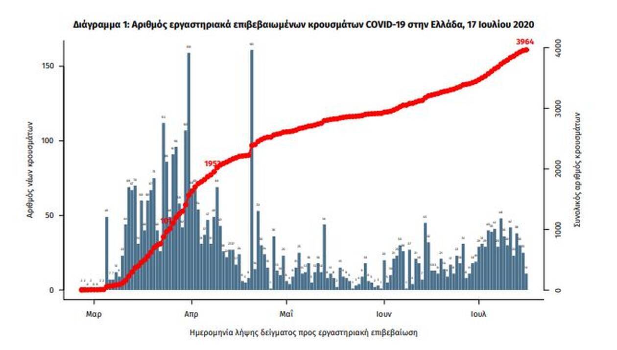 Την Παρασκευή ο Εθνικός Οργανισμός Δημόσιας Υγείας (ΕΟΔΥ) ανακοίνωσε 28 νέα κρούσματα του νέου κορονοϊού στη χώρα, εκ των οποίων τα 12 εντοπίστηκαν κατόπιν ελέγχων στις πύλες εισόδου τις χώρας. Την ίδια ώρα, οι νεκροί ανέρχονται στους 194 καθώς ακόμη μια ηλικιωμένη γυναίκα κατέληξε.