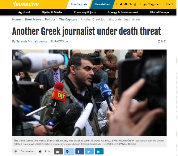 #Greece: Only 2 weeks after a Greek crime reporter Giorgos Karaivaz was assassinated in a mafia-style attack, the owner of @documentonews and journalist @KostasVaxevanis has reported death threats & has been placed under police protection. pic.twitter.com/PdY9t0VW9F