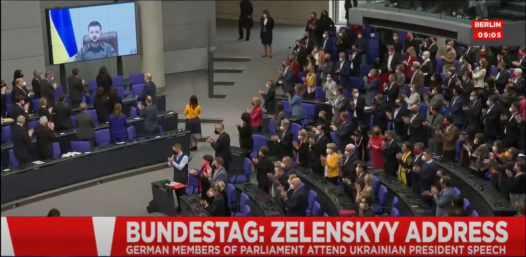 Αφού οι παριστάμενοι στη γερμανική Βουλή χειροκρότησαν όρθιοι τον Ζελένσκι, όταν ξεκίνησε η βιντεοσύνδεση, στη συνέχεια εκείνος χαρακτήρισε «ανεπαρκείς τις κυρώσεις» που έχουν ανακοινωθεί ως τώρα «για να σταματήσει ο πόλεμος», σημείωσε πως «ιδιωτικές επιχειρήσεις συνεχίζουν να κάνουν δουλειές με τη Ρωσία» και τόνισε, απευθυνόμενος στους Γερμανούς, πως «ενεργείτε κυρίως οικονομικά».