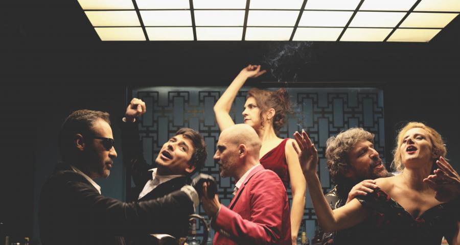 Στη σκηνή δεσπόζει ένα μεγάλο τραπέζι, ως απομεινάρι του γαμήλιου γεύματος, πίσω από το οποίο βρίσκεται μια πολύχρωμη σατέν κουρτίνα, που αποκρύπτει μέσα στη «λάμψη» της το εσωτερικό του «σπιτιού». Ο διάκοσμος (σκηνικά/κοστούμια: Μαντώ Ψυχουντάκη) και ο φωτισμός της σκηνής (Στέλλα Κάλτσου) παραπέμπουν σε disco των δεκαετιών’80-’90s, με τη disco μπάλα να κυριαρχεί στο κέντρο. Τα κοστούμια περίτεχνα και εκκεντρικά αποτελούν κι αυτά υπαινικτικές εικόνες της ίδιας περιόδου. Ο σκηνικός χώρος είναι κοινός για τις πράξεις που εκτυλίσσονται εντός κι εκτός σπιτιού. Τα πρόσωπα είναι συνεχώς παρόντα στη σκηνή και τα δρώμενα εκτυλίσσονται κυρίως γύρω από το «τραπέζι» με αρκετά στιγμιότυπα στατικά, όπου οι συνδαιτυμόνες ακινητοποιημένοι, καθήμενοι στις καρέκλες, συμμετέχουν σε σκηνές δράσης μόνο με τον εκφερόμενο λόγο τους και με στυλιζαρισμένες χειρονομίες. Ο λόγος εύληπτος και λειτουργικός (μετάφραση/διασκευή Μ. Κάλμπαρη) καθώς και η προσθήκη κειμένου στην έναρξη με αναφορές στους Hobbes, Darwin, Freud, σχετικά με το σεξ, τον έρωτα, τον γάμο, την καταστροφή, τον θάνατο ως εφαπτόμενους κύκλους.