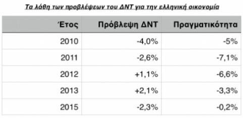 Οι ίδιες πηγές επισημαίνουν ότι το 2010, το ΔΝΤ προέβλεπε ύφεση -0.4% και η ύφεση ανήλθε στο 5%. Το 2011 προέβλεπε ύφεση -2,6% και η ύφεση ανήλθε στο 7,1%. Το 2012 προέβλεπε ανάπτυξη 1,1% και η ελληνική οικονομία παρουσίασε ύφεση 6,6%. Αντίστοιχα, το 2013, προέβλεπε ανάπτυξη 2,1% και υπήρξε ύφεση 3,3%, ενώ για το 2015, προέβλεπε ύφεση 2,3% και το έτος κλείνει με – 0,2%.
