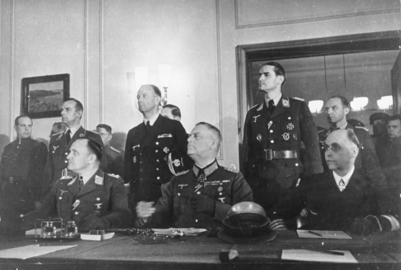 Την ανώτατη γερμανική στρατιωτική διοίκηση εκπροσώπησαν ο στρατάρχης Κάιτελ, ο ναύαρχος Φρίντερμπουργκ και ο στρατηγός της αεροπορίας Στουμπφ. Την αντιπροσωπεία της αντιχιτλερικής συμμαχίας αποτέλεσαν: από μέρους της ΕΣΣΔ ο στρατάρχης Γ. Κ. Ζούκωφ, από μέρους της Αγγλίας ο στρατάρχης της αεροπορίας Α. Τέντερ, από μέρους των ΗΠΑ ο στρατηγός Κ. Σπάατς και από τη Γαλλία ο στρατηγός Ντε Λατρ ντε Τασινύ. Ύστερα από αυτή την εξέλιξη ο μεγαλύτερος και πιο αιματηρός πόλεμος που γνώρισε ποτέ η ανθρωπότητα τερματίζεται στην Ευρώπη.