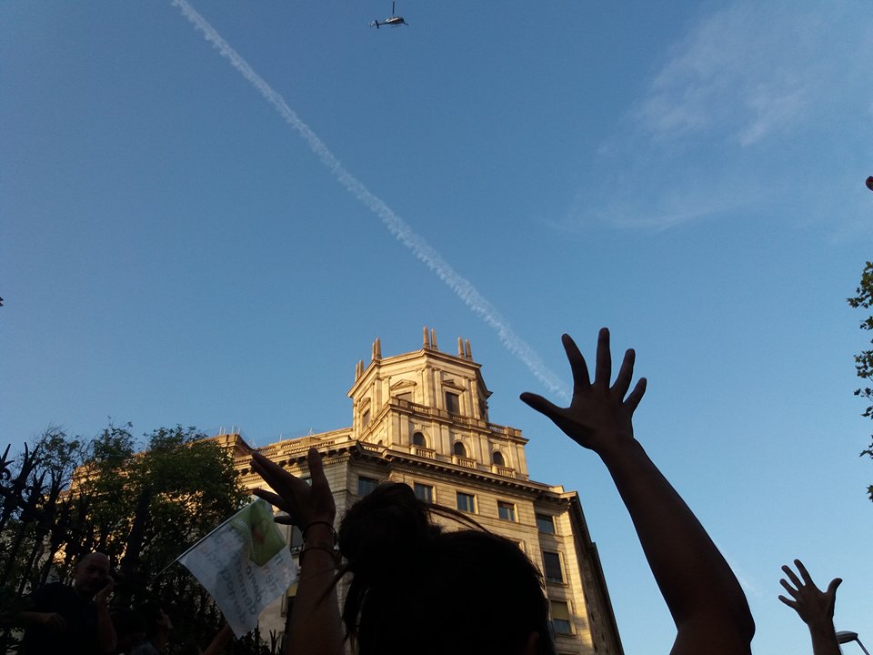 Οι διαδηλωτές φωνάζουν συνθήματα στα ελικόπτερα της αστυνομίας όπως «χωρίς τις στολές δε θα ήσασταν τίποτα»