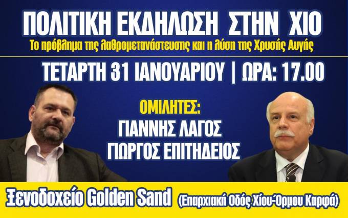 Κάλεσμα σε φορείς και πολίτες να γυρίσουν την πλάτη στους Χρυσαυγίτες από τους Αλληλέγγυους Χίου, την Επιτροπή Αλληλεγγύης στους πρόσφυγες Χίου «ΛΑΘΡΑ;» και τη Χιακή Συμπολιτεία, που επισημαίνουν ότι στην επικείμενη εκδήλωση των Χρυσαυγιτών στο ξενοδοχείο Golden Sand, «οι υπόδικοι ναζί θα προσπαθήσουν να παρουσιάσου την λογική του μίσους και της εξόντωσης των αδύναμων σαν αυτονόητη και θεμιτή λύση».