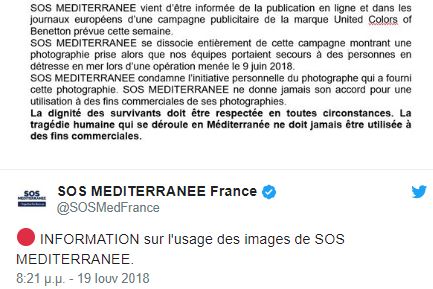 Σε καταγγελίες κατά της ιταλικής εταιρείας ενδυμάτων Benetton, προέβη η μη κυβερνητική οργάνωση «SOS Méditerranée» αναφορικά με φωτογραφία που χρησιμοποίησε η εταιρεία για διαφημιστικούς σκοπούς. Η φωτογραφία απεικονίζει μετανάστες ντυμένους με σωσίβια γιλέκα, τους οποίους η ΜΚΟ διέσωσε από το πλοίο Aquarius. Υπενθυμίζεται ότι το πλοίο μετέφερε 629 πρόσφυγες με την Ιταλία να αρνείται να το δεχθεί και τελικά να γίνεται δεκτό από την Ισπανία.