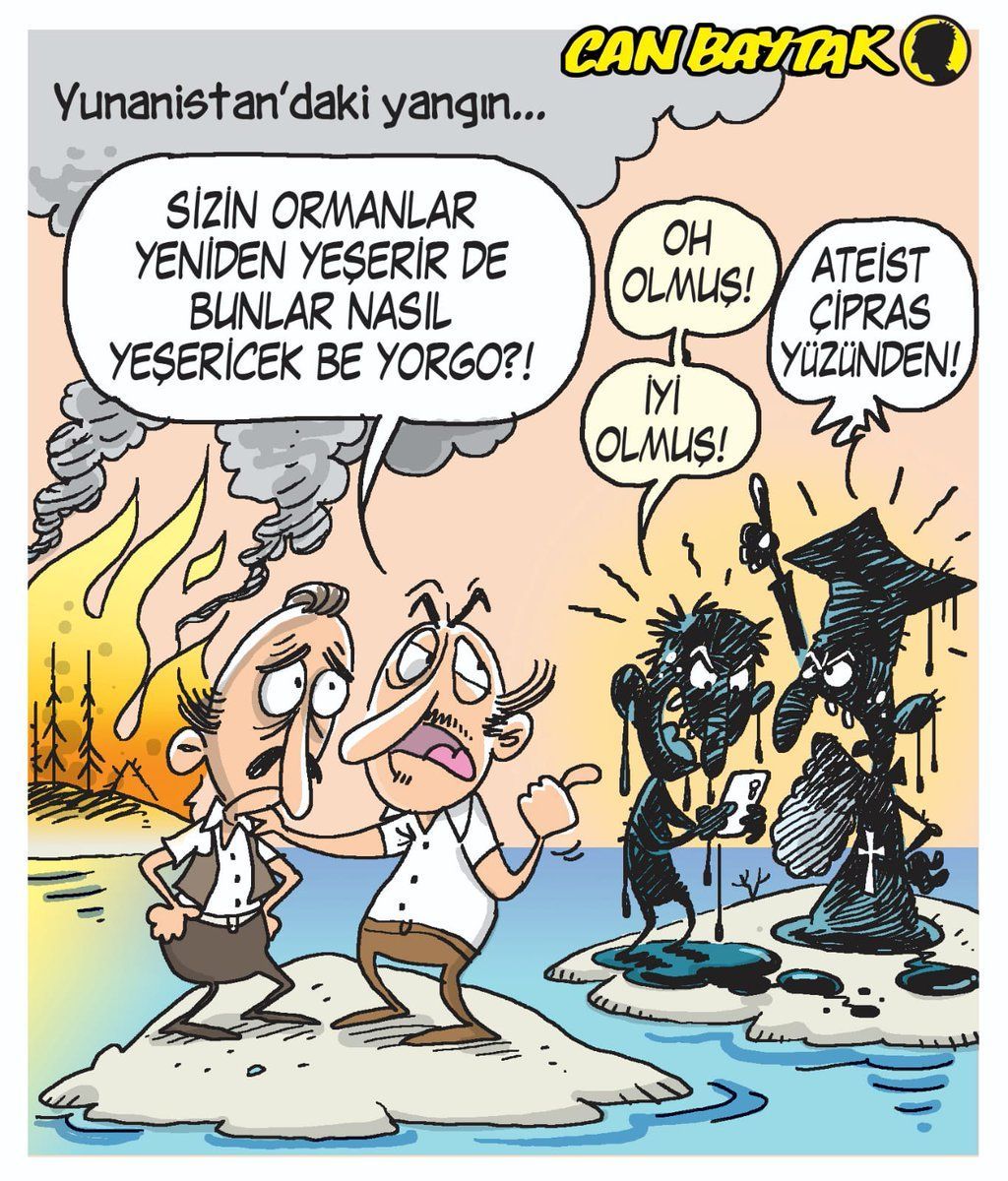 Το σκίτσο που δημοσιεύτηκε στον ιστότοπο HaberTurk απεικονίζει δύο άνδρες που συζητούν πως «Tα δάση, η φύση θα ξαναγίνει, θα ξαναφυτρώσουν, αλλά με αυτούς εκεί τι θα γίνει;», ενώ δίπλα τους βρίσκονται «απανθρακωμένοι» ένας Τούρκος εθνικιστής και ο Αμβρόσιος, και δείχνοντάς τους συπληρώνουν πως «Άνθρωποι ξανά δεν γίνονται!».