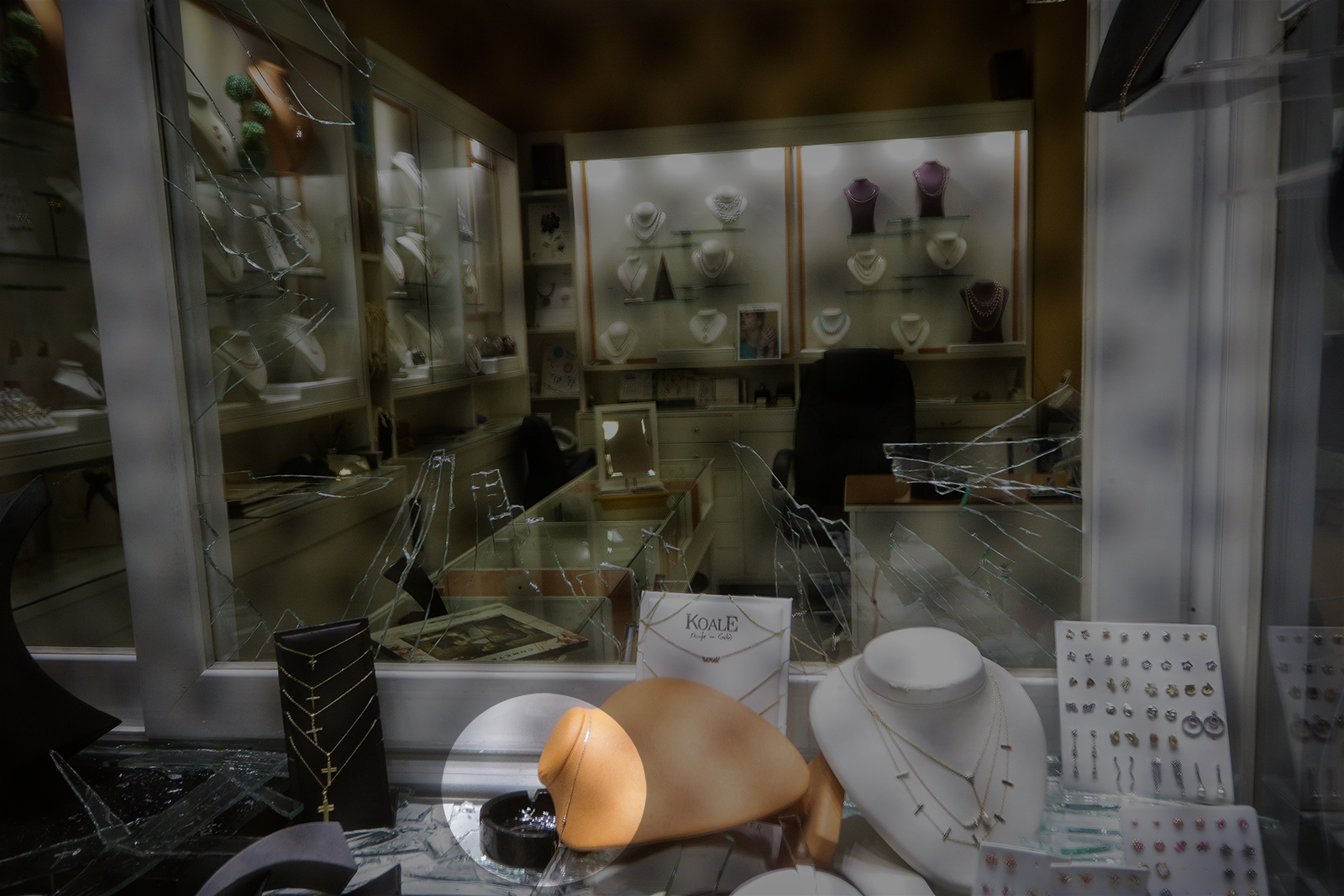 Ήμασταν εδώ, μετά τις 2 το μεσημέρι την προηγούμενη Παρασκευή, δε θυμάμαι ακριβώς τί ώρα, αρχίζω να ακούω φασαρία από κάτω και, κυρίως, τζάμια να σπάνε. Βγαίνω λίγο έξω και βλέπω πάρα πολύ κόσμο μαζεμένο και δύο που είναι μπροστά να πετάνε αντικείμενα και να σπάνε τη τζαμαρία. Δε θυμόμουνα καν τι μαγαζί είναι απέναντι. Και, αν δεις, δεν φαίνεται πολύ καλά, δε βλέπεις καθόλου το εσωτερικό. Οπότε, βλέπω δύο τύπους να κλωτσάνε τη τζαμαρία και σπάνε και να πετάνε αντικείμενα.