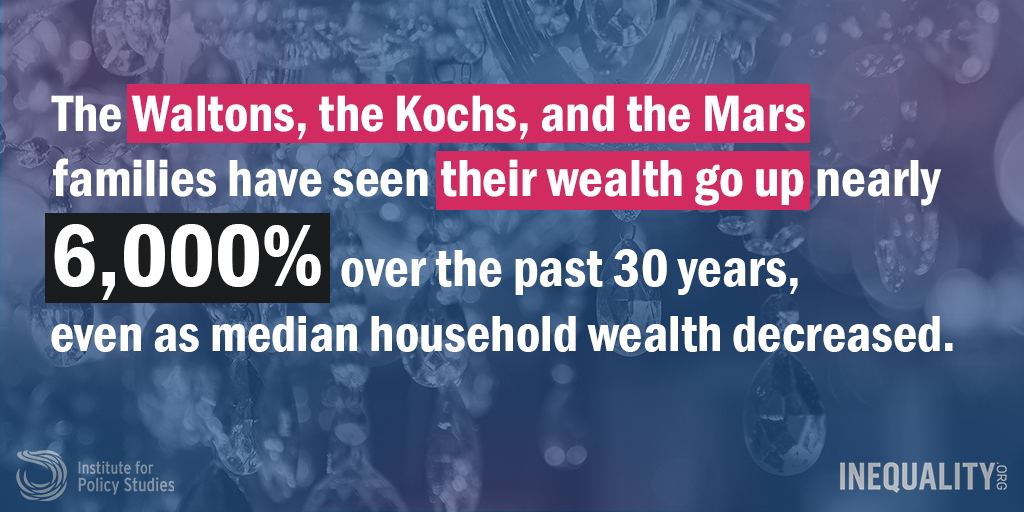 Κατά 6.000% έχουν δει τον πλούτο τους να αυξάνεται οι τρεις πλουσιότερες οικογένειες στον κόσμο από το 1982 μέχρι και σήμερα, την ώρα που ο μέσος όρος του πλούτου ανά νοικοκυριό μειώθηκε κατά 3% την ίδια περίοδο. Τζεφ Μπέζος, Μπιλ Γκέιτς και Γουόρεν Μπάφετ, οι τρεις πλουσιότεροι δισεκατομμυριούχοι του πλανήτη κατέχουν σήμερα πλούτο ίδιο με αυτόν του μισού πληθυσμού των ΗΠΑ.
