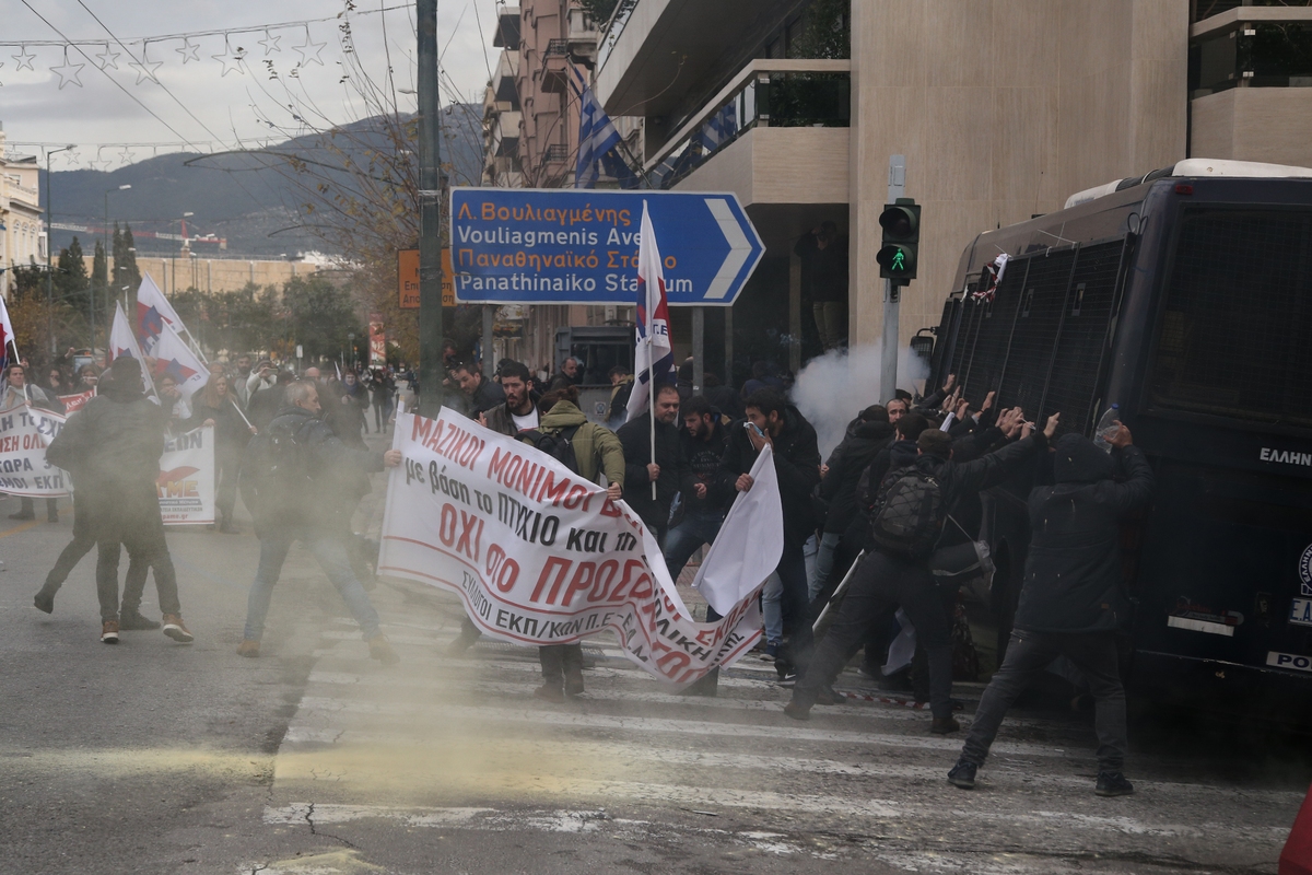 Σύμφωνα με την ΕΡΤ, αρχικά, δυνάμεις της αστυνομίας απώθησαν με γκλομπ και ασπίδες τους διαδηλωτές, προκειμένου μην μπουν στο προαύλιο της Βουλής.Στη συμβολή της Βασ. Σοφίας με την Ηρώδου του Αττικού συγκεντρωμένοι επιχείρησαν να αναποδογυρίσουν τις κλούβες των ΜΑΤ που βρίσκονται στο σημείο, με την ΕΛΑΣ να απωθεί κάνοντας χρήση χημικών.