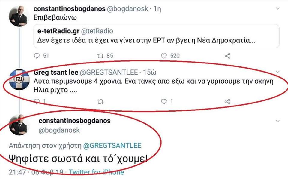 Αρχικά, ο Μπογδάνος σχολίασε με «Επιβεβαιώνω» μια ανάρτηση του e-tetradio.gr, που υποστήριξε ότι «δεν έχετε ιδέα τι θα γίνει στην ΕΡΤ αν βγει η Νέα Δημοκρατία».