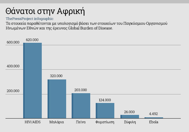Μπορεί ο Ebola να έχει αναστατώσει ολόκληρο τον κόσμο αλλά η Αφρική μαστίζεται από προβλήματα που δεν κεντρίζουν το παγκόσμιο ενδιαφέρον. Στο παρακάτω πίνακα εμφανίζεται μια εντελώς διαφορετική εικόνα. Τα στοιχεία δείχνουν τους 5 λόγους για τους οποίους έχουν χαθεί περισσότεροι άνθρωποι από τον Μάρτιο του 2014, οπότε και ξέσπασε ο Ebola, μέχρι σήμερα.